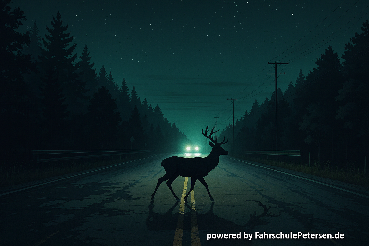 Ein Schild mit einem springenden Hirsch zeigt dir, dass Wildwechsel möglich ist. Besonders betroffen sind waldreiche Gebiete sowie Straßen, die durch Felder oder entlang von Flüssen führen. Die Gefahr ist in der Dämmerung und nachts besonders hoch, da Wildtiere dann am aktivsten sind. Wie reagierst du richtig?